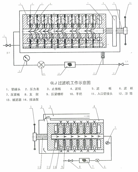 使用前應首先檢查過濾床的部分濾板、濾框、濾紙的安放位置是否正確,參照過濾機工作示意圖和過濾床的工作原理進行安放,在止板前和壓緊板后放三張濾紙,以防止油壓力強被吹破,期于每塊濾板、濾框之間放兩張濾紙(也可根據用戶需要另配濾布),一定按照過濾床的工作原理和過濾機工作示意圖放置,不可放錯方向和位置。